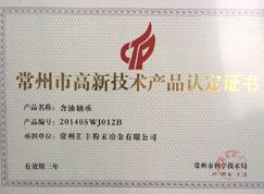高新技术产品认定证书(粉末冶金自润滑含油轴承)、ISO证书等多种证书。